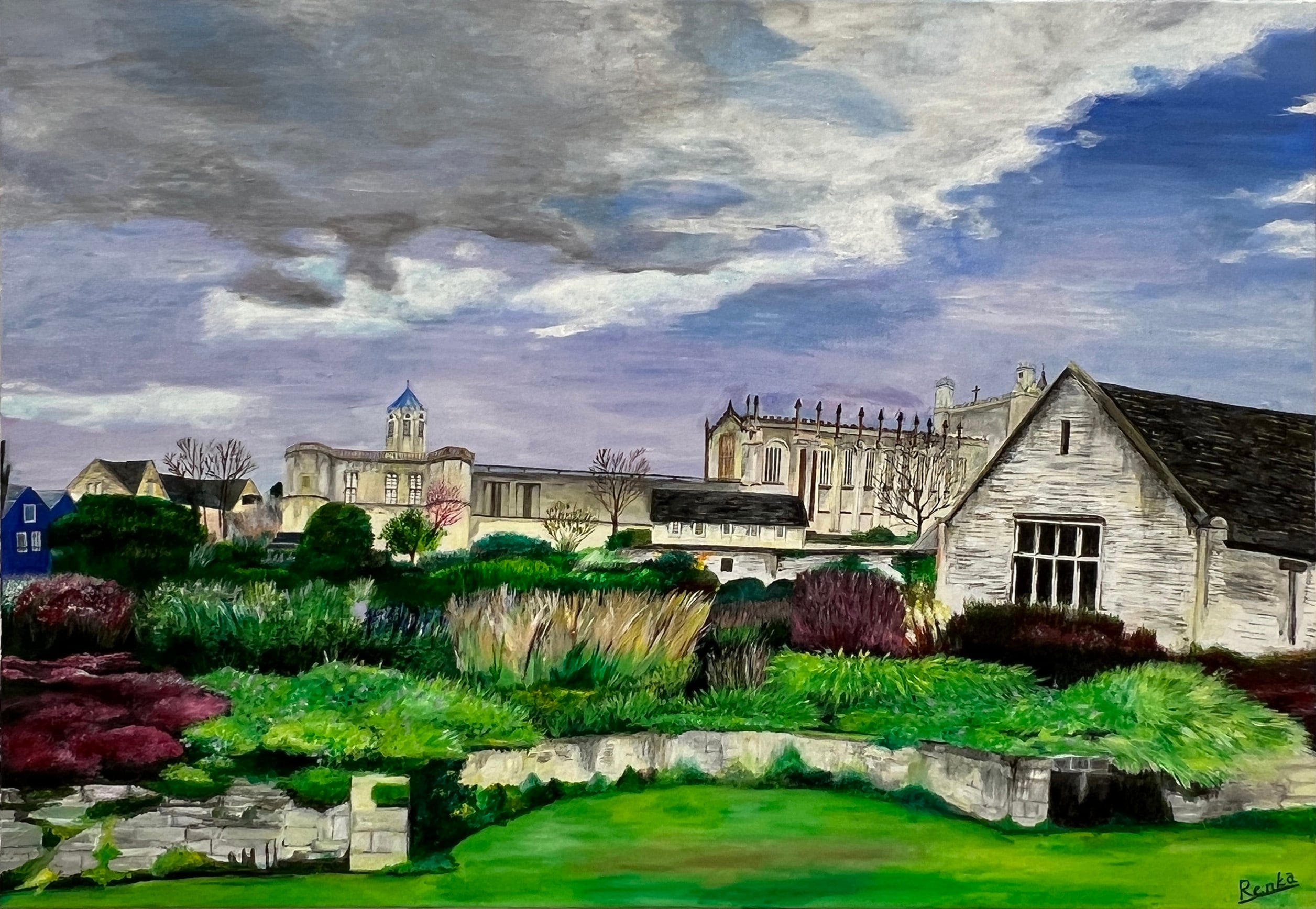 2023年オックスフォードに滞在していた時初冬の寒い時期であるにも関わらず、野原の草花は元気よく育ち花をつけていました。昔からの建物を維持し管理を行い、近くにある原野や自然を愛するイギリスの田舎を風景画で描きました。